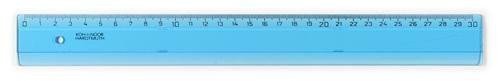 30 cm ruler made of blue transparent polystyrene. The scale is embossed using hot stamping technology. The accuracy of the scale is 0.2% of the length. It is intended for school and office use. It is packaged in a printed polypropylene bag with a euro hanger.