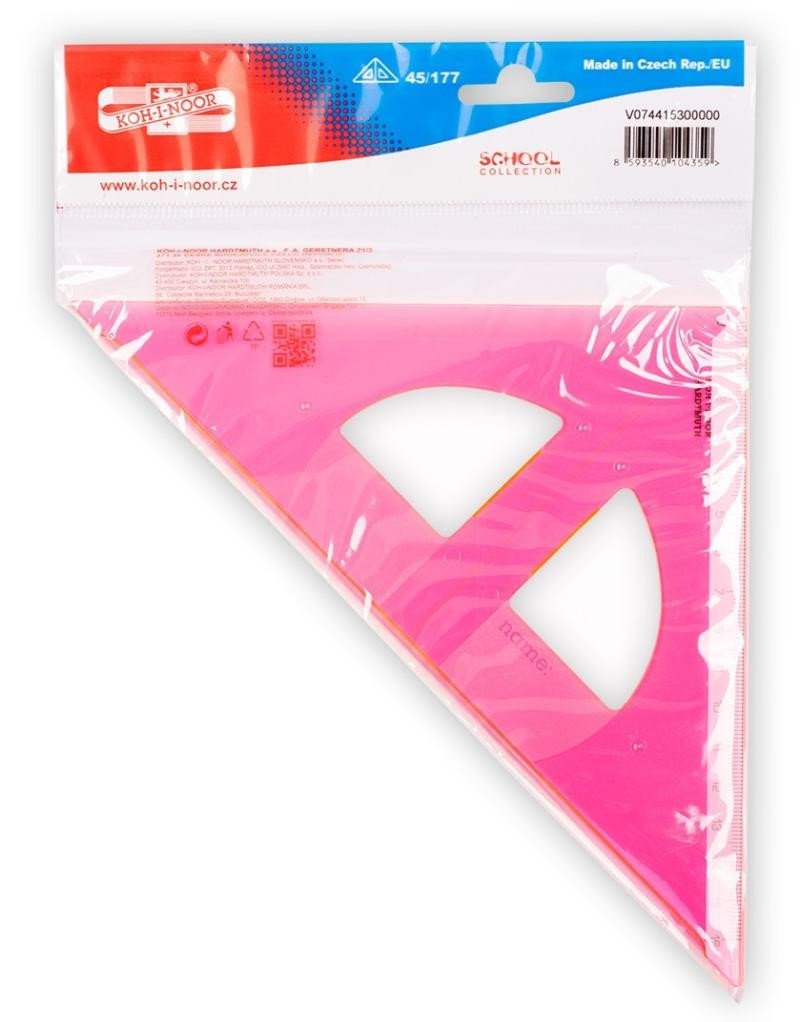 Triangle 45/177 with a perpendicular made of pink transparent polystyrene. The scale is embossed using hot stamping technology. The accuracy of the scale is 0.2% of the length. In addition to the length scale, it is equipped with a marking for constructing perpendiculars. The triangle is intended for drawing and technical drawing in schools and offices. It is packaged in a polyethylene bag with a euro hanger.