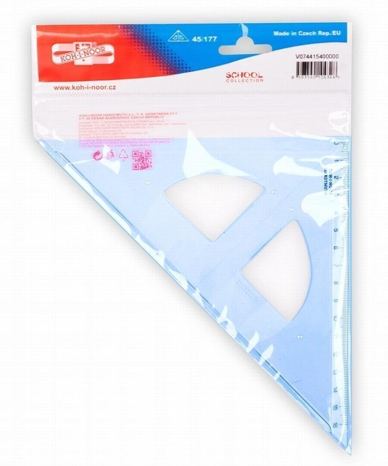 Triangle 45/177 with a perpendicular made of blue transparent polystyrene. The scale is embossed using hot stamping technology. The accuracy of the scale is 0.2% of the length. In addition to the length scale, it is equipped with a notch for constructing perpendiculars. The triangle is intended for drafting and technical drawing in schools and offices. It is packaged in a polyethylene bag with a euro hanger.