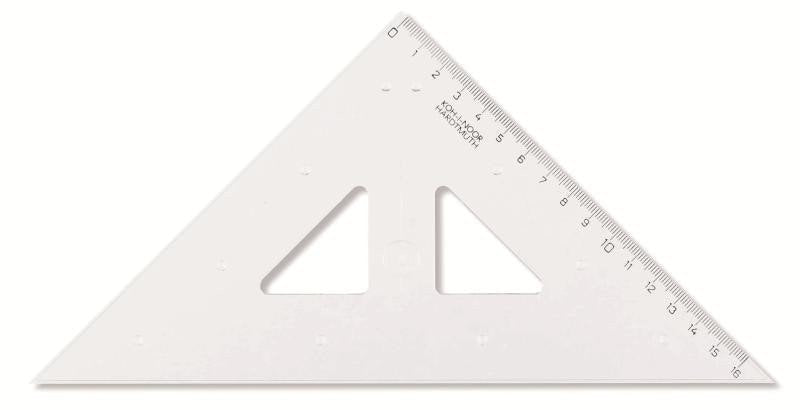 Triangle 45/177 with a perpendicular and cutouts made of clear transparent polystyrene. The scale is embossed using hot stamping technology. The accuracy of the scale is 0.2% of the length. In addition to the length scale, it is equipped with a notch for constructing perpendiculars. The underside is fitted with cutouts. The triangle is intended for technical drawing in schools and offices. The advantage is the cutouts for more comfortable work with ink and easier sliding on paper. It is packaged in a polyethylene bag with a euro hanger.