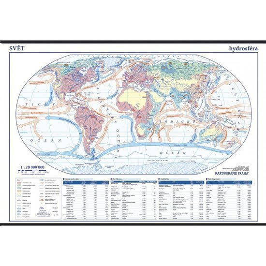 Die Karte der weltweiten Hydrosphäre zeigt deutlich die wichtigsten Wasserläufe und Gewässer der Welt, grenzt die Hauptmeere ab und veranschaulicht Richtung und Eigenschaften der Meeresströmungen. Ergänzt werden diese Basisdaten durch Informationen zum Salzgehalt der Meere und Ozeane, zu den Gezeitenständen sowie zu den durchschnittlichen und maximalen Abflüssen der wichtigsten Wasserläufe.