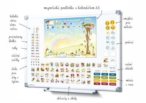 When will the holidays be? When will we go cycling? When will we go shopping? Teach children to plan their favorite activities with the Kindergarten magnetic calendar. The magnetic board, which can be placed on any metal surface such as a refrigerator or board, awaits the planning of the best activities according to the seasons. Children learn numbers, colors, names of months, days of the week, and shapes in a fun way. They can note what the weather was like or how they liked their day. The board can hold up to 114 different magnets with rounded corners. You can also write on the magnets with a dry-erase marker. The Kindergarten magnetic calendar is designed for children aged 3 and up. Key features of the Kindergarten magnetic calendar: Children learn to plan their responsibilities or favorite activities; Magnetic board that can be placed on any metal surface; Children learn numbers, colors, names of months, days of the week, and shapes in a fun way; A total of 114 different magnets with rounded corners; You can also write on the magnets with a dry-erase marker; The Kindergarten magnetic calendar is designed for children aged 3 and up. Package contents: 12 × numbers for composing dates (20 × 20 mm); 12 × months of the year (55 × 20 mm); 4 × seasons (55 × 20 mm); 50 × activities, tasks (40 × 40 mm); 4 × smiley faces…