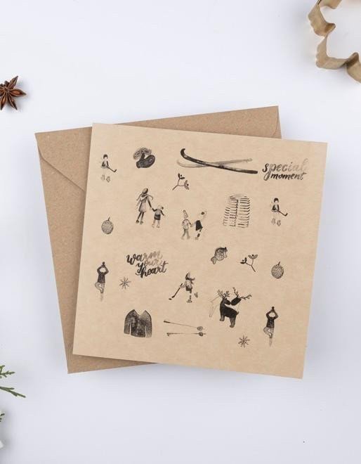 Be Nice EKO greeting card - Natural brown. In simplicity lies beauty, and this Christmas card expresses just that. Christmas motifs stand out beautifully on high-quality brown paper. The original designs were created by Czech illustrator Bára from Nikolajka. The paper is recycled and recyclable. Made in the Czech Republic. Size: 15.5 x 15.5 cm. There is no text inside the card, allowing you to write a sweet message.