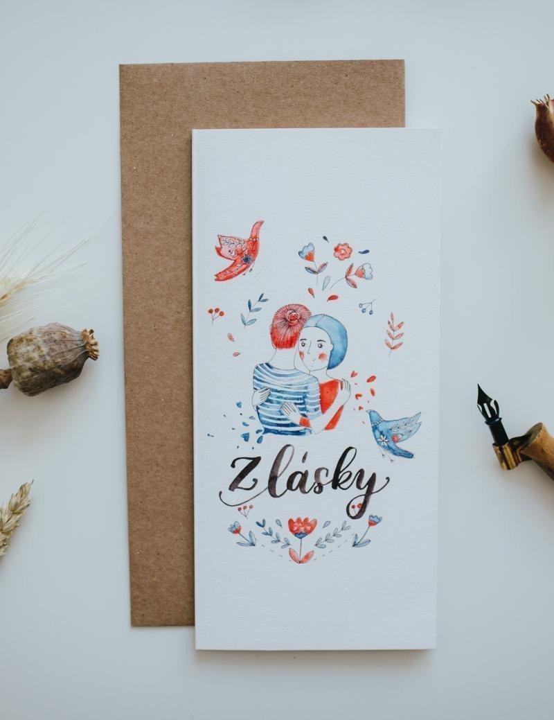 Be Nice EKO card From Love. Give a beautiful From Love card featuring the original design of an embracing couple. The card is ideal as an addition to a gift, flowers, or even on its own. The card is blank inside, allowing you to write a beautiful heartfelt message. The card was illustrated by Czech artist Bára from Nikolajka. Size: 10 x 21 cm.