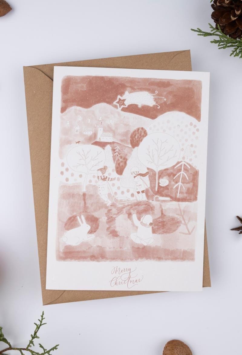 Be Nice EKO Christmas card made from recycled paper. English speakers will surely appreciate a Christmas card with the text Merry Christmas and a calligraphic English text inside. Inside text: Peace, good will and happiness for you at Christmas and always. The card was illustrated and beautifully handwritten by Czech artist Bára from Nikolajka. Size: 14.7 x 21 cm