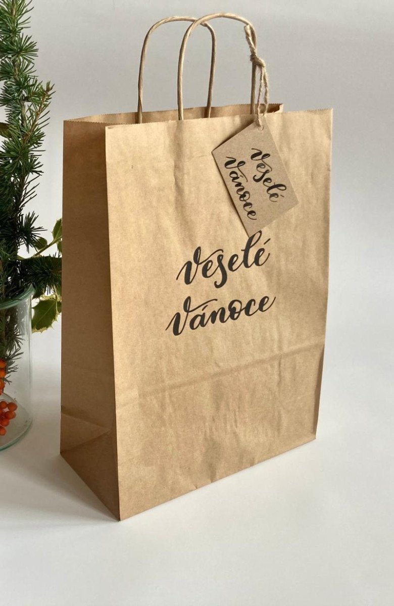 Be Nice gift bag with a name tag. Are you practical and don't want to use a lot of paper for wrapping gifts? Simply place them in a gift bag with a Christmas message and name tag. This way, the recipient will have all the gifts in one place. And as a Christmas bonus: the bag is made from natural brown paper, complemented by a nice name tag, and can be reused. The print 'Merry Christmas' was created by Czech illustrator Bára from Nikolajka.