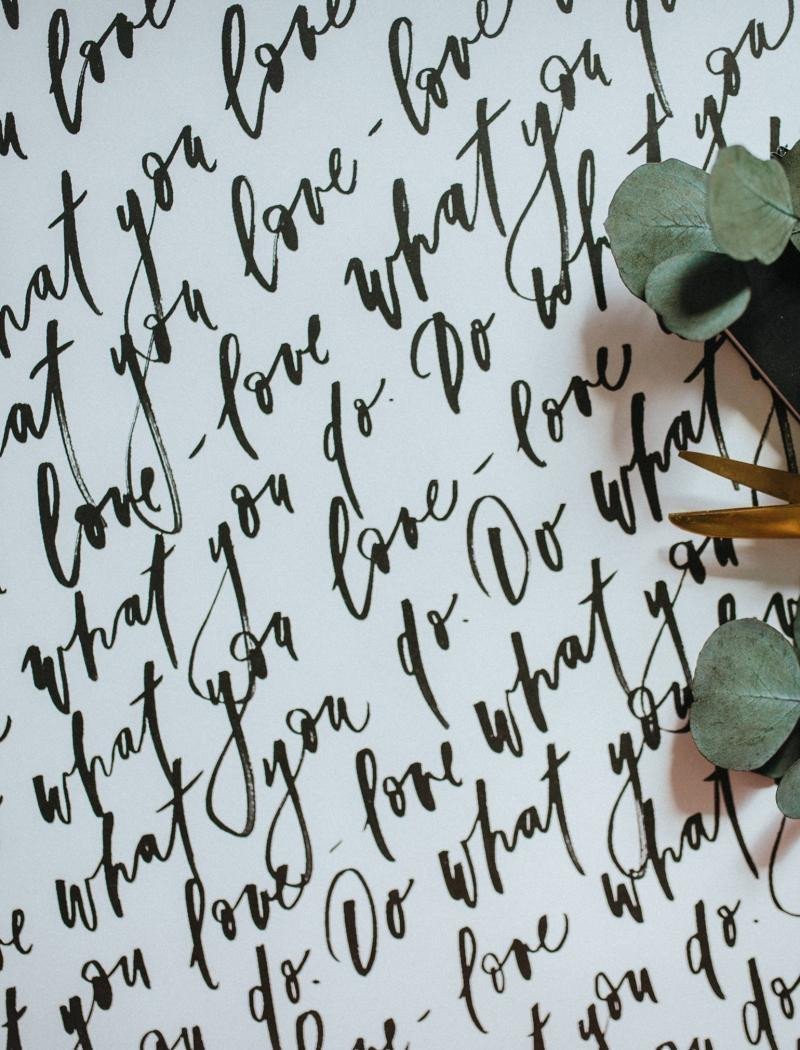 Be Nice EKO wrapping paper with the quote 'do what you love - love what you do' on white paper. Original designs were created by Czech illustrator Bára from Nikolajka.