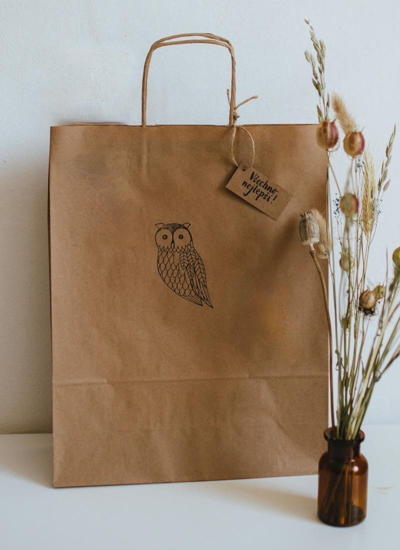 Be Nice natural gift bag featuring an owl motif and a decorative name tag. Dimensions 32 x 41 cm.