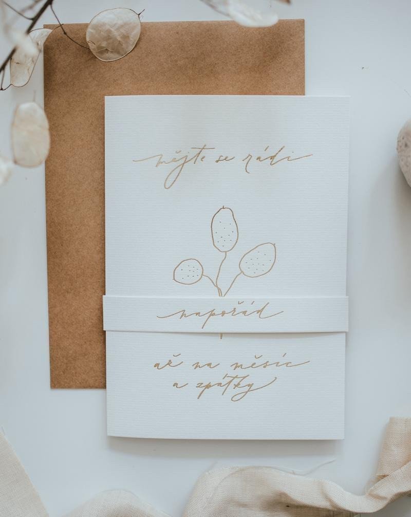 Be Nice Wedding Card Forever - light. Support the newlyweds on their special day and give them an exclusive wedding card with gold embossing and a ribbon. The delicate motifs of the moonflower on the card were illustrated by Czech artist Bára from Nikolajka. Size: 14.5 x 21 cm. Instructions: Once you write a message to the newlyweds or include a gift in the card, wrap the ribbon with the text 'forever' around the card and seal it at the back.