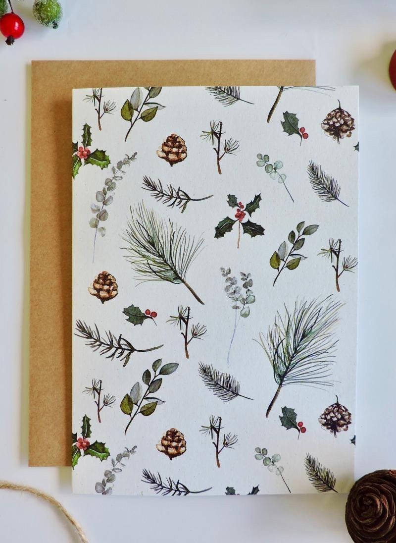 Be Nice EKO Christmas card made from recycled paper. Do you also love the scent of pine needles? The card In Pine is a tribute to all Christmas trees on paper. Inside it has the text MERRY CHRISTMAS. The original designs on the card were created by Czech artist Bára from Nikolajka. Size: 12 x 17 cm.