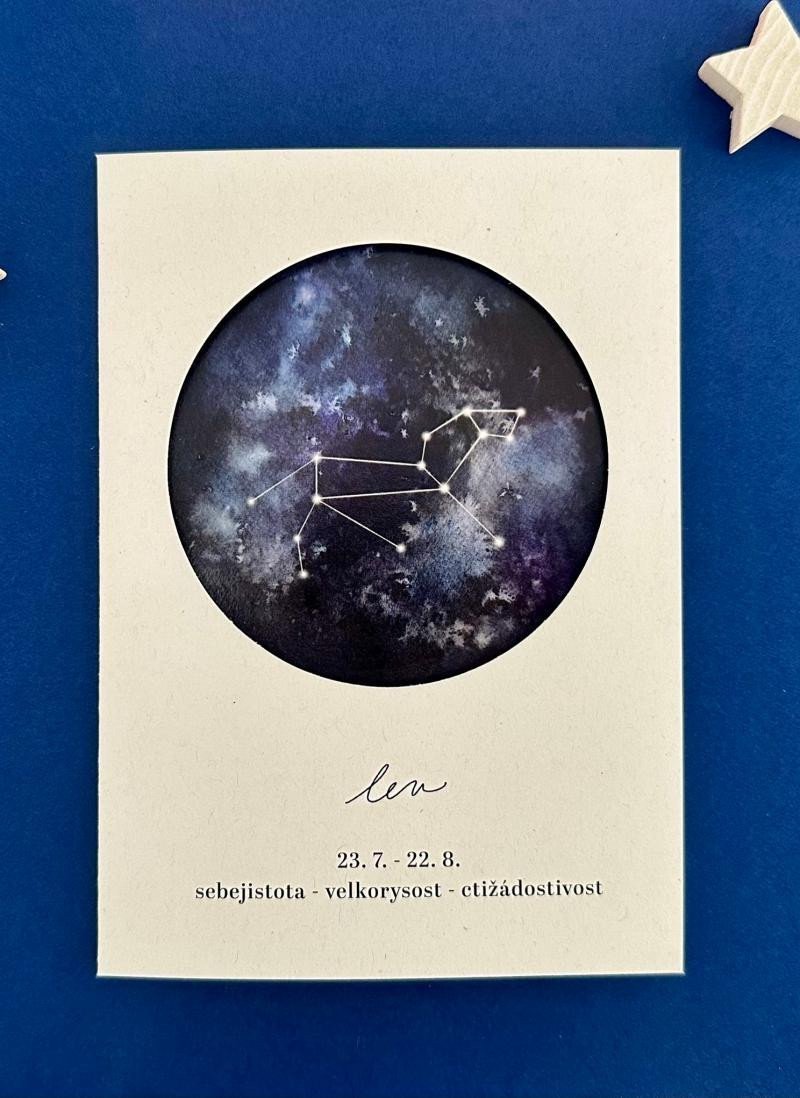 Be Nice EKO greeting card Zodiac Sign - Leo. Do you believe that zodiac signs are part of us and tell something about us? A beautiful card that carries the positive traits of the sign and is complemented by its own constellation. All this together with beautiful text and a unique design of a truly cosmic card. The card has a cut-out on the front cover. The card was illustrated by Czech artist Bára from Nikolajka. Size: 12 x 17 cm.