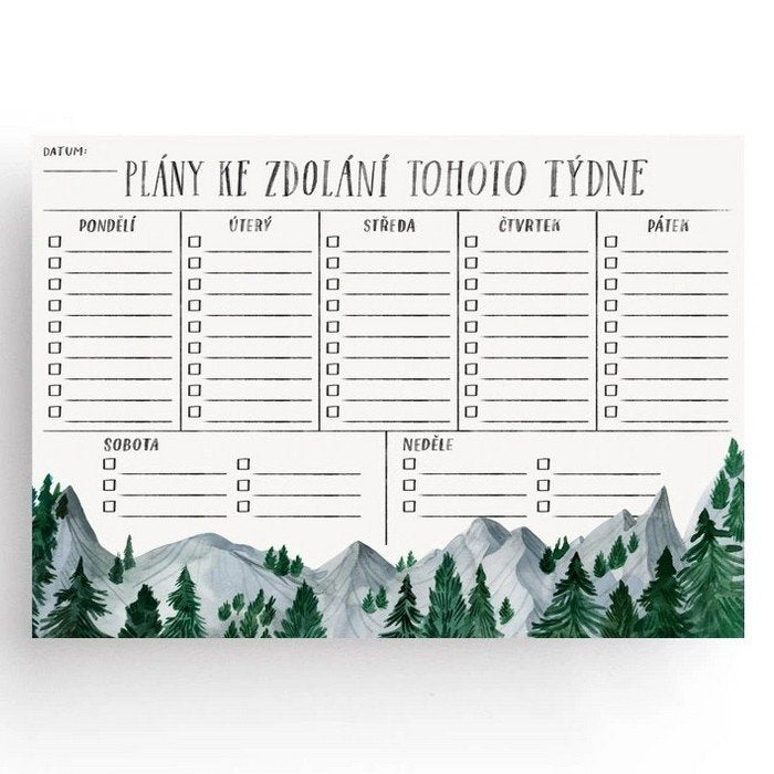 The weekly planner will help you with task completion from Monday to Sunday. Clearly record your tasks by day and check them off as you complete them. You will find one sheet for each week (total of 52 sheets). The planner features an original mountain design.