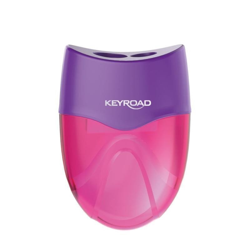 Colorful plastic sharpener with a transparent container for visible amounts of shavings. 2 openings with diameters of 8 mm and 11 mm. Ergonomic shape allows for easy holding. Supplied in pink.