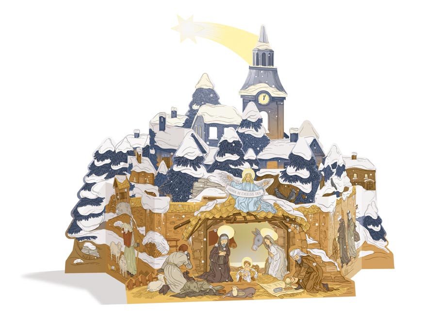 A colorful foldable nativity scene made of cardboard. Assemble a paper nativity scene with Joseph, the Virgin Mary, and baby Jesus in the manger. You will also find the Three Wise Men, or magi from the East, Caspar, Melchior, and Balthazar depicted here. Assembly is very simple and requires no tools.