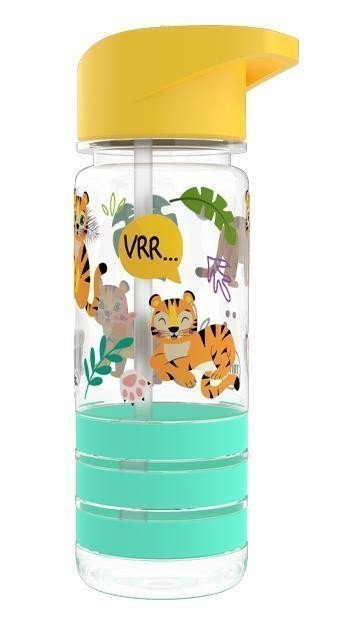 The children's bottle with a straw is made of high-quality Tritan material, has rubber strips for better grip, and a capacity of 550ml.