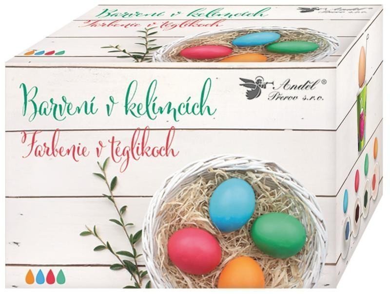 Create beautiful Easter eggs with dyeing in cups. Easy and simple to use! The package contains: 4 paper cups with dye attached to the bottom, egg holder Colors: red, green, blue, orange Instructions: Boil the eggs in salted water. Pour hot water into about half of the cup and add 2-3 tablespoons of vinegar. Dip the warm eggs one by one until you achieve the desired color and let them dry. For a glossy finish, you can lightly coat them with kitchen oil. One cup dyes 4 - 5 eggs.