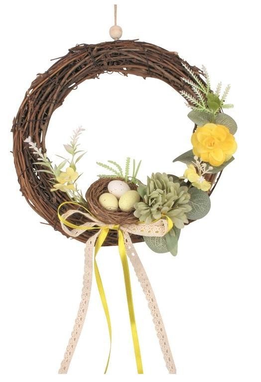 Věnec s dekoracemi a hnízdem 20 cm, žlutá stuha