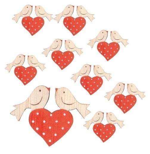 Srdíčko s ptáčky s lepíkem dřevěné 4 cm, 24ks v krabičce