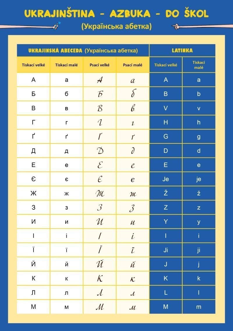 This educational laminated card contains a basic overview of the Ukrainian alphabet with a simple and clear translation into Czech.
