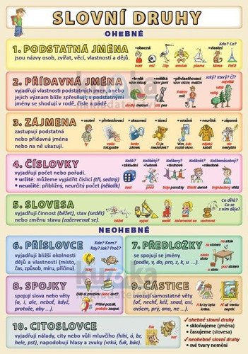 Klar strukturierte Wortartenübersicht mit Beispielen und anschaulichen Abbildungen. Enthält grammatikalische Bedeutungen von Substantiven, Muster, grammatikalische Bedeutungen von Verben und Beispiele zur Verbkonjugation. Abbildungen von Petr Kopl.