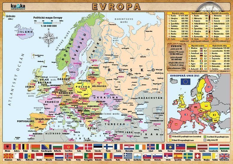 Eine politische und physische Karte Europas, einschließlich einer Karte der Europäischen Union. Sie enthält die Nationalflaggen der europäischen Länder, Tabellen mit einer Rangliste der Länder nach verschiedenen Kriterien und eine Tabelle mit geografischen Angaben.