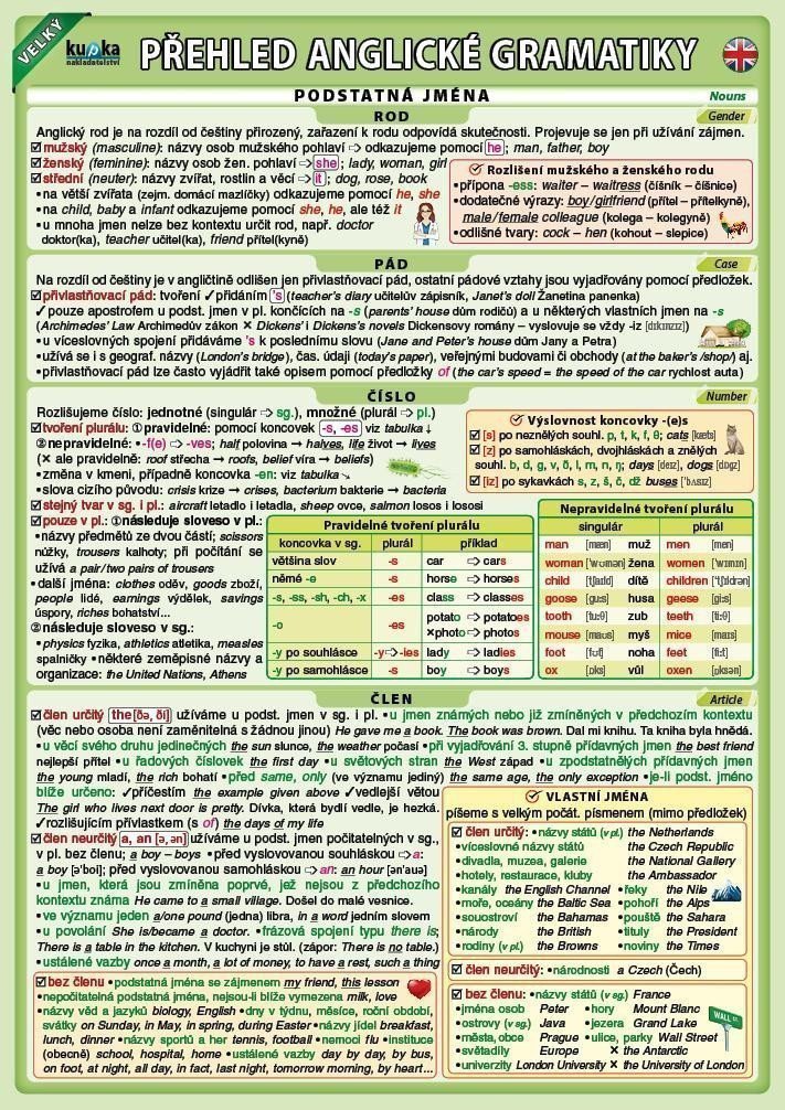 Ein umfassender Überblick über die englische Grammatik, jetzt im größeren und übersichtlicheren A4-Format und mit zahlreichen Illustrationen. Der Überblick ist nach Wortarten gegliedert und behandelt außerdem direkte und invertierte Wortstellung, Zeitformen, zusammengesetzte Sätze sowie eine Seite mit einer übersichtlichen Tabelle der unregelmäßigen Verbformen. Er eignet sich für Schüler der Grund- und Sekundarstufe.