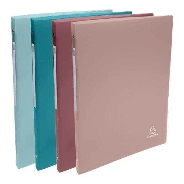 A flexible ring binder in a mix of soft colors. Printed logo on the front, labeling tag on the spine of the folders. Eco-friendly composition of folders made from PP material that is easy to clean and maintain without dirt. •format: A4 maxi •dimensions: 250 × 320 •material: recycled PP •mix of colors: ice blue, petrol, salmon, old pink •ring "O" mechanism: 4 x O 15 mm without locking •spine label for description •Blue Angel certification