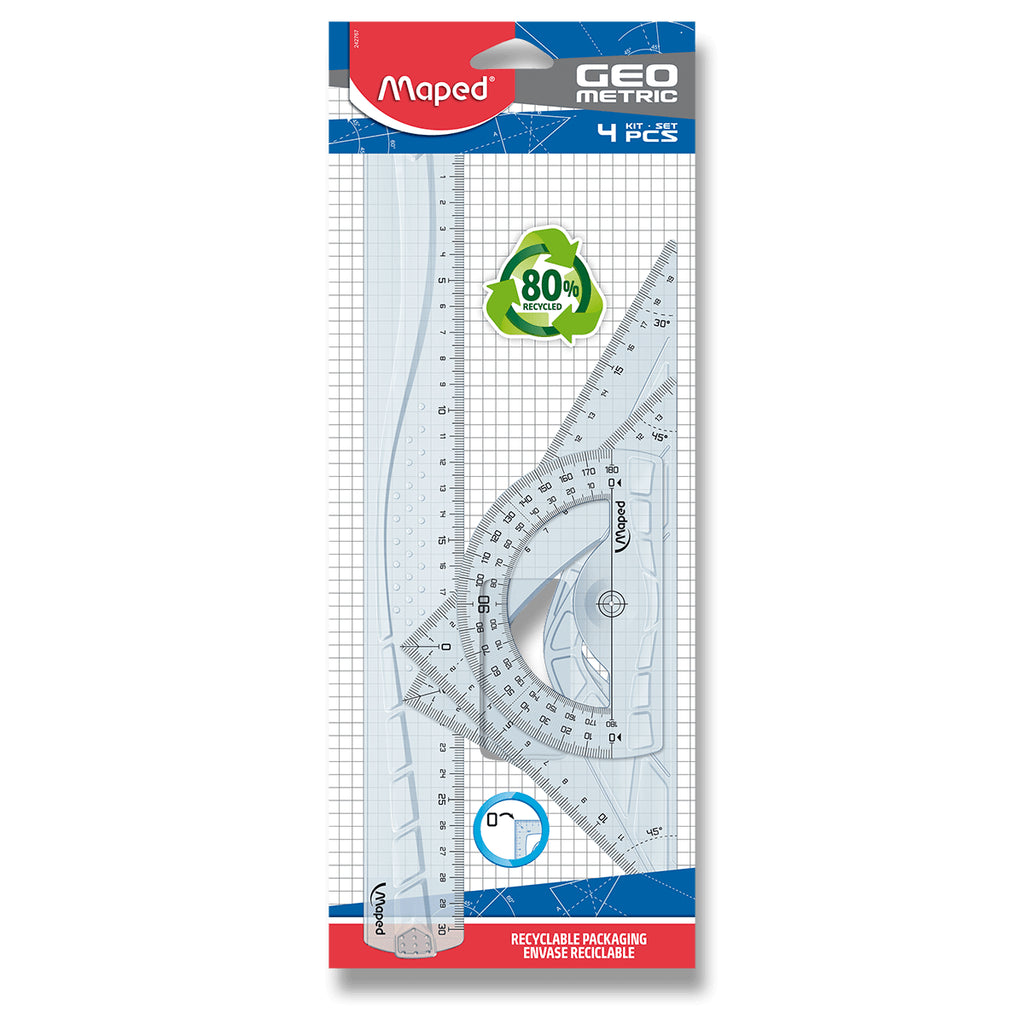 4-piece drafting set with high-quality markings. The scales are printed using UV ink and are maximally durable. The set includes: 30 cm ruler, 60°/21 cm triangle, 45°/21 cm triangle, 180°/12 cm protractor.