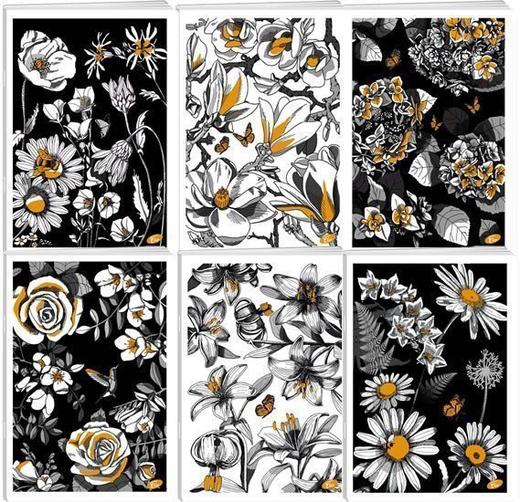 Collection of notebooks featuring drawings on the cover. Floral designs with a gold glitter effect on a matte cover. Quality notebooks with sewn binding and a sturdy glossy cover. A4 format, 40 sheets (80 g paper), lined. A total of 6 designs.