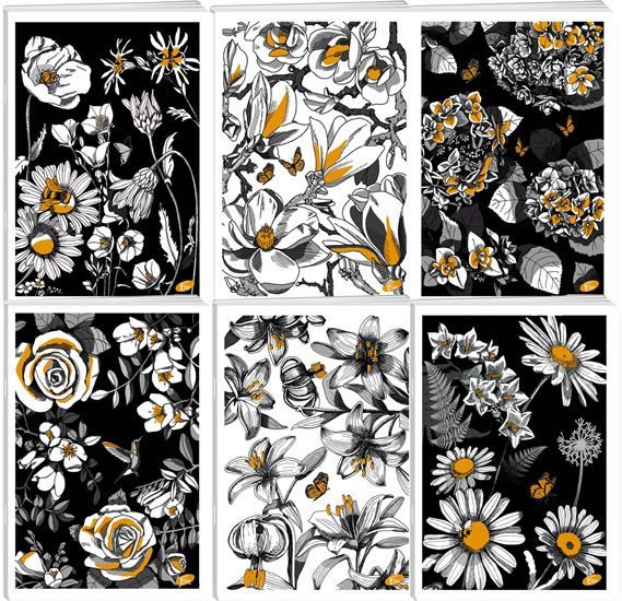 Collection of notebooks featuring drawings on the cover. Floral designs with a gold glitter effect on a matte cover. Quality notebooks with sewn binding and a sturdy glossy cover. A5 format, 40 sheets (80 g paper), lined. A total of 6 designs.