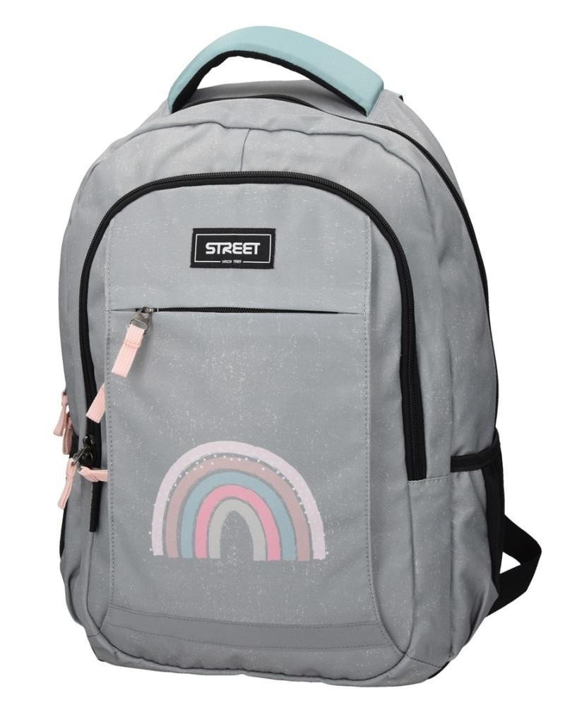 Quality, ergonomically shaped lightweight student backpack with a 3D back system. The padding is made of breathable material. There are pockets on the sides of the backpack for a drink bottle. It consists of 3 compartments.