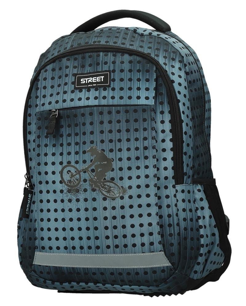 Quality, ergonomically shaped lightweight student backpack with a 3D back system. The padding is made of breathable material. There are pockets on the sides of the backpack for a drink bottle. It consists of 3 compartments.