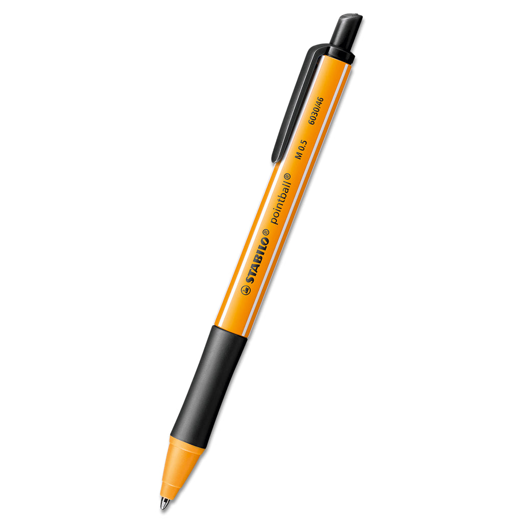 Whether for writing in the office, at school or university, or for taking notes at home, the STABILO pointball is always the right choice. Its colorful design in orange with white stripes resembles the world-famous fine liner STABILO point 88. Thanks to the rubberized grip zone, the ballpoint pen is comfortable and secure in hand and does not slip. The soft refill ensures quick and smooth writing. In the interest of environmental protection, the ballpoint pen with a push mechanism is CO2 neutral, and emissions are fully compensated. Once empty, it can be refilled with STABILO Ballpoint Refill cartridges. It is available in six colors - blue, black, red, green, purple, and turquoise. Among these, the blue, black, and green colors are non-erasable.