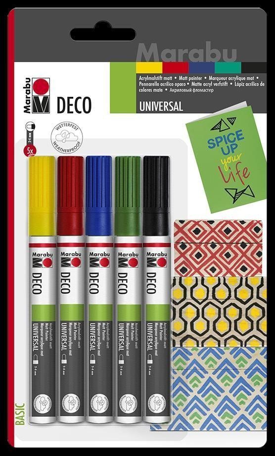 Marabu acrylic marker 5 x 2-4 mm Acrylic painting without brushes! Thanks to this brand of paint, brushes are outdated. The innovative tip provides controlled and rich application of color, as if by magic and without the time-consuming task of collecting more paint. Painting on canvases or large patterns on clay pots, wooden frames, or simply on paper. You will love it. High coverage allows for painting and writing even on dark surfaces. Children also love using this marker because it is odorless and dries quickly. Water-based. The 5-piece set includes colors Sunshine Yellow, Cherry, Mint, Lapis, and Black. Matte water-based acrylic marker for schools, crafts, and leisure. Very good coverage, quick drying. Light, fast, and weather-resistant. Suitable for painting all smooth and porous surfaces, such as paper, wood, terracotta, metal, plaster, and plastics. Effective writing with a calligraphy pen - Always keep the calligraphy tip in the same position while writing to achieve more effective lettering. Even flow of paint - During painting, it is necessary to repeat the pumping to ensure an even flow of paint. Close the cap, shake the marker, and pump only 2 to 3 times. Never leave the marker open...