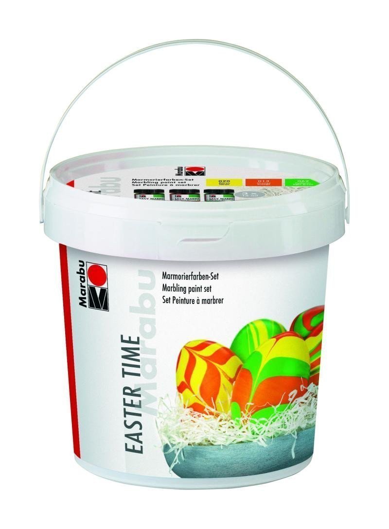 Complete set, 3 x 15 ml colors of lemon 020, orange 013, and light green 062, 5 plastic eggs, height: 60 mm, 7 wooden spatulas, length: 100 mm, approximately 10 g of Easter grass and instructions, in a plastic bucket. Brilliant marble colors create trendy Easter decorations. The elegant color combination adds something interesting to every Easter basket. - you can start immediately: complete set - solvent-based paint - dries in about 15 minutes - can be wiped with a damp cloth after fully drying - for unpainted items - supplied in a practical plastic bucket that can also be used as a dyeing container.