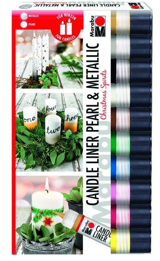 With the Candle Liner Christmas Spirits version, you can individually paint and describe candles for Christmas. Candles, advent wreaths, or Christmas arrangements become unique thanks to custom-made candles. A wide color range: 10 colors. Creamy, soft water-based wax paint for designing candles. Odorless, lightfast, and frost-resistant. Techniques: painting directly on the candle or transferring designs using a stencil. Drying time approx. 4 hours. Contents: yellow 019, pink 133, cherry red 031, medium blue 052, green 216, medium brown 040, white 070, black 073, metallic silver 782, metallic gold 784