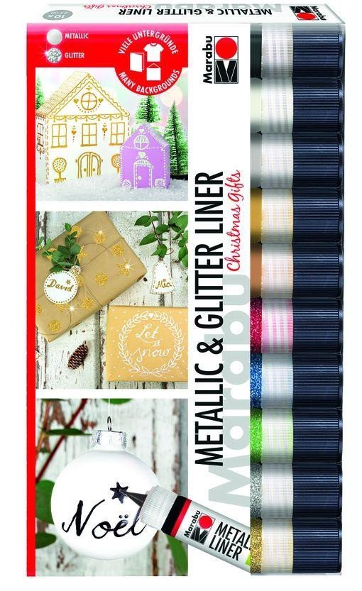 With the Metallic & Glitter Liner Christmas gift set, you can individually paint and write on various items for Christmas. Christmas ornaments, tree decorations, colors, or gifts will receive a personal touch. A wide range of colors: 5 glittery and 5 metallic shades. A versatile water-based, lightfast effect paint with metallic and glitter effects. Painting surfaces: paper, wood, metal, glass, leather, plastic, textiles (with a maximum of 20% synthetic fibers). Techniques: Painting, writing, decorating. After fixing with an iron (back side for 3 minutes without steam) or in a dryer (8 min. / 150 °C), textiles are washable up to 40 °C. Drying time: approx. 6-12 hours. Contents: 5 x 25 ml Marabu Metallic Liner (metallic graphite 779, metallic white 770, metallic silver 782, metallic gold 784, metallic copper 787), 5 x 25 ml Marabu Glitter Liner (Glitter ruby 538, Glitter sapphire 594, Glitter kiwi 561, Glitter silver 582, Glitter gold 584)