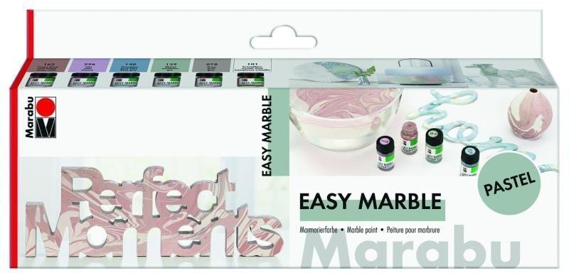 Marble effects will take over the design world - create your own designer pieces with a subtle pastel touch: Drip, dip, done! Bright pastel shades based on organic solvents are ideal for both light and dark colored items made of glass, ceramics, plastic, wood, and paper. Drip the marble paint onto the water, draw patterns, slowly dip the item, and quickly pull it out again. White pigments in pastel shades settle strongly and need to be shaken vigorously before use. If necessary, remove the drip cap and mix. The intensity of the color depends on the size of the water container and the amount of paint applied. Instructions with tips in the included brochure. Contents: 6 x 15 ml light marble (Rose taupe 165, Lilac 296, Gray blue 140, Mistletoe 159, Gray 078, Crystal clear 101), 1 x instruction manual.