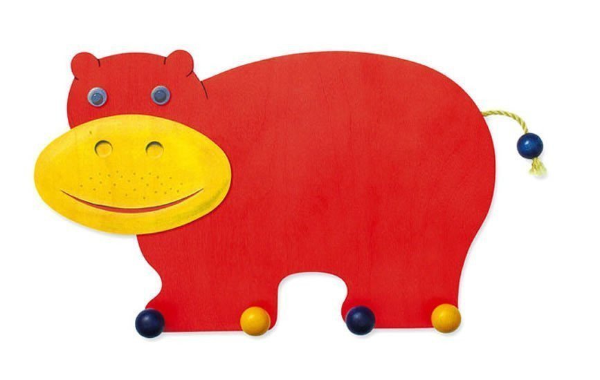 A smiling wooden hippopotamus with bulging eyes and a freely moving tail, serving as a coat rack for your little ones. The coat rack is in red-yellow design with 4 hooks. A message from the hippo for you: "I am 44 cm long."