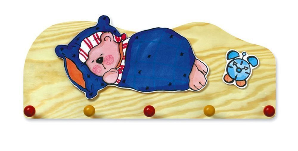 Wooden coat rack as a decoration for any child's room, with five handles, natural wood, featuring a colorful picture of a sleeping teddy bear. Dimensions: 60x5x24 cm.