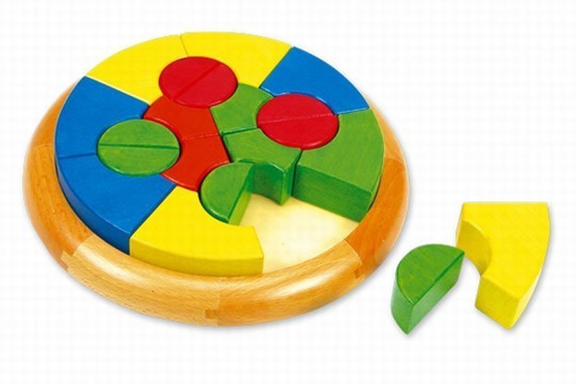The Rondo Formen construction set with wooden blocks in vibrant colors on a basic circular wooden base. It teaches to recognize colors, shapes, and sizes, supports the ability to combine, and develops imagination. Dimensions 24x24x4 cm.