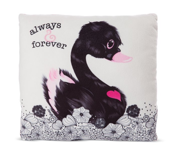 Always and forever! With the square LOVE pillow, which is both elegant and cuddly, you can never go wrong! An ideal gift for all ages – not just for couples and lovers. The fluffy plush pillow features a high-quality printed image of the unique black swan LOVE with pink and black-and-white color accents on the front. The back of the pillow is in a soft pink shade. With the pillow counterpart "White LOVE Swan," available separately, you can create a swan couple whose necks form a heart and are considered a symbol of endless love. For the new LOVE Classic collection, which is part of the NICI GREEN initiative, plush and filling materials made from recycled materials, such as old PET bottles, are almost exclusively used. Dimensions: 30x30 cm