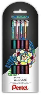 Gift set of four Pentel Hybrid Dual Metallic gel pens in the color combination ORANGE/METALLIC YELLOW, GREEN/METALLIC BLUE, VIOLET/METALLIC BLUE, PINK/METALLIC PINK. Hybrid Dual Metallic contains glitter. The shimmering rich line changes color depending on whether it's used on white or black paper. The gel line is 0.9mm, uniform, and quick-drying. The ink is water-based, can be blended on watercolor paper to a fade, but the glitter effects remain. Glitter can also be removed from the tip ball with a fine nylon brush Pentel Aquash and used as decoration. Alternatively, draw on smooth foil and use the Pentel Aquash brush to pick up the colored line and glitter. Suitable for calligraphy, bullet journaling, embellishment, decoration, highlighting, and crafting. Durable plastic body with a cap. Comfortable hexagonal grip. The glittery covering line changes color depending on whether it's used on white or black paper. Conical tip with a 0.9mm line.