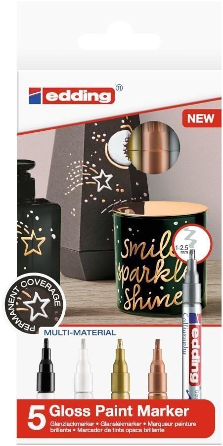 The EDDING 753 calligraphy marker set of 5 in metallic colors is designed for permanent decorative writing and embellishing on smooth, transparent, and dark materials, such as glass, metal, plastic, and chalk paper. It features brilliant, high-gloss sparkling metallic colors. The colored pigment ink is quick-drying, extremely lightfast, and resistant to smudging, wear, and weathering. The valve system allows for a consistent flow of ink for perfect coverage and opacity. It is equipped with a special calligraphy tip, enabling strokes from fine to broad, with a line width ranging from 1 to 2.5 mm. Easy and clean to use for spontaneous creativity.