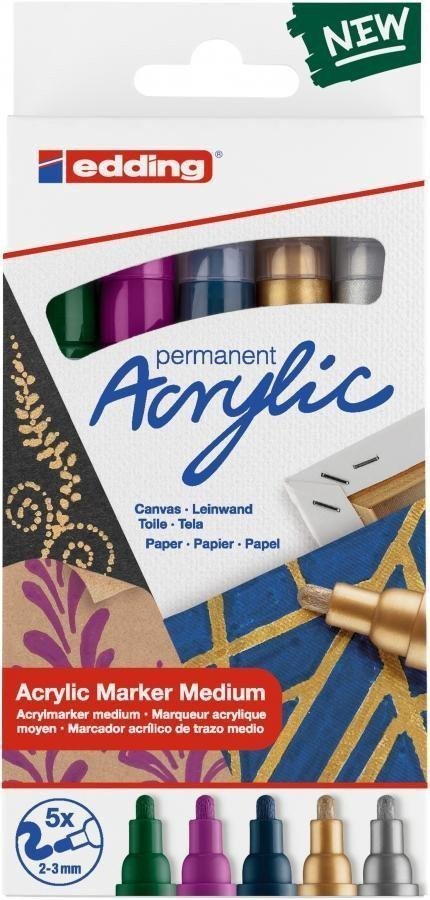 Set of 5 acrylic markers edding 5100 M in festive metallic colors for spontaneous creativity on both light and dark surfaces such as canvas, painting paper, smooth wood, and stone. The high-quality pigmented water-based acrylic paint is permanent, lightfast, and odorless once dry. Suitable for creative expression by artists and amateurs alike. The paint in the form of a pump marker is easy to apply. The marker is always ready to use, with no brushes or additional supplies needed. Just open, pump, and start painting. The valve system allows for a consistent flow of ink. The Metallic set includes: highly opaque colors (moss green, red-violet, elegant night blue) and semi-transparent colors (rich gold, silver). The durable round tip with a stroke width of 2-3 mm allows for precise strokes. It can be combined with other acrylic markers and sprays from edding 5200. The use is very simple: remove the protective film, shake the marker thoroughly before removing the cap, pump the tip of the marker preferably against a paper pad until the tip is sufficiently saturated with ink. Store horizontally and at room temperature. Replacement tips are available separately. Made in Germany.