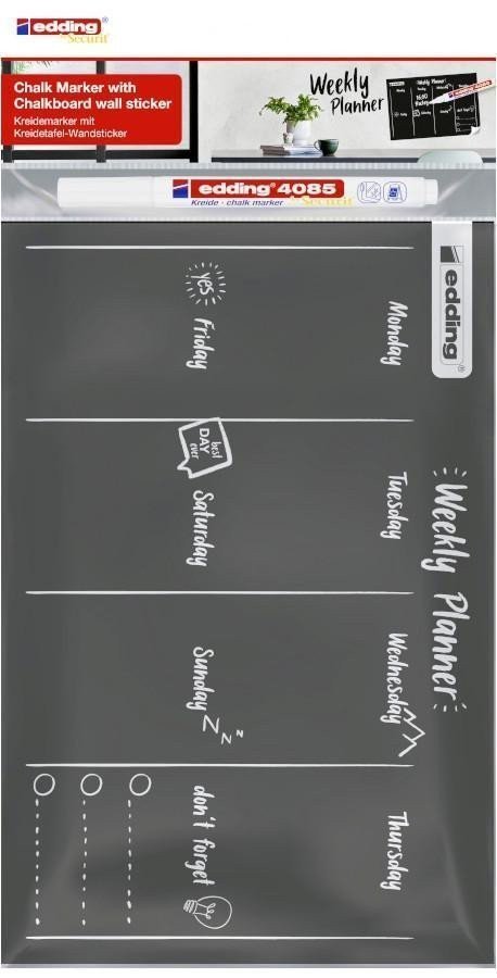 A set of white chalk markers edding 4085 and a weekly planner. The edding 4085 chalk marker is a non-permanent pen in the form of liquid chalk. The fine tip offers a clean, precise line. The water-based ink stands out for its high opacity, making the written line very visible. The chalk marker can be used for writing on windows, glass, plexiglass, mirrors, and dark boards. The ink can be wiped off all non-porous materials with a damp cloth. Edding liquid chalk is popular in hotels, restaurants, bars, and also in the glass industry. It is also used for decorating and labeling windows in homes and offices. The ink flow is controlled by a valve, so it is necessary to shake the marker before first use, remove the cap, and allow the ink to flow to the tip by gently pumping. Store horizontally. Round tip. Line width: 1-2 mm. The weekly planner in the form of black self-adhesive foil is easily removable and repositionable. The schedule can be written on with chalk markers that are washable with a damp cloth. The planner can be stuck to all smooth surfaces. Dimensions: 30 x 20 cm.