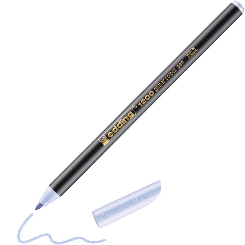 Glitter marker edding 1200 with water-based ink for decorative writing. The written line contains fine glitter that gives the text a festive pearlescent appearance. Glitter markers are especially suitable for decorative writing on light paper (postcards, greeting cards, name tags, and messages). Round tip with a line width of 1-3 mm. Best stored tip down.