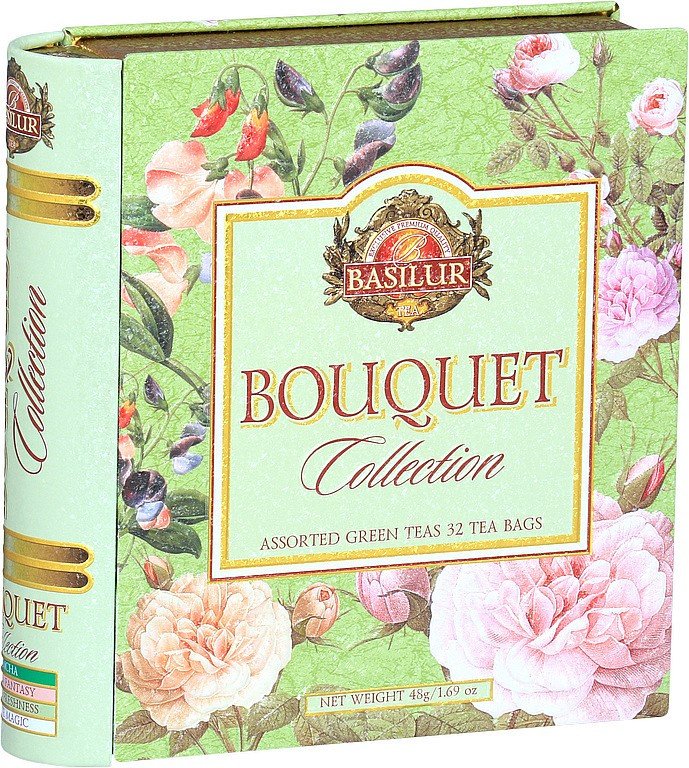 Gift collection of green teas flavored with plant parts (fruit pieces), packaged. Ingredients: Green Freshness, ingredients: green tea, mint. Cream Fantasy, ingredients: green tea, strawberry and vanilla aroma. White Magic, ingredients: semi-fermented Oolong tea, (milk aroma). Sencha Green, ingredients: green tea.