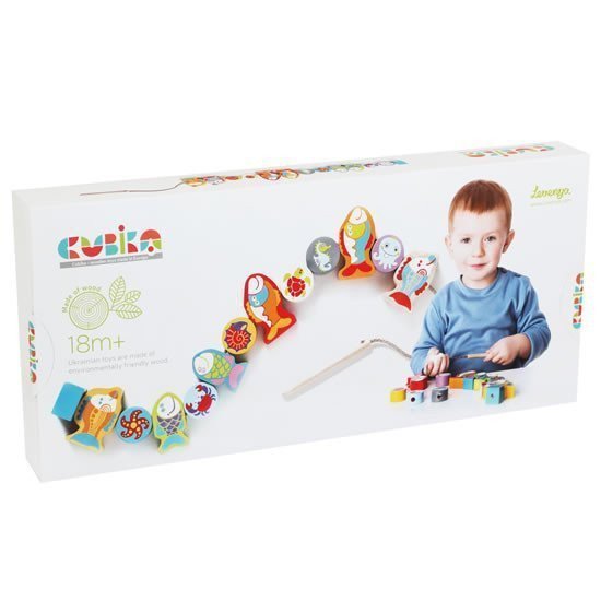 CUBIKA is a new brand of wooden toys made only from sustainably sourced wood, featuring very precise craftsmanship and appealing design. The threading fish and sea creatures are an ideal game for practicing fine motor skills, patience, and memory. The set offers 12 wooden threading pieces with a marine theme, one lace with a wooden peg for threading on one side and a stopper on the other side, and 8 templates with variously arranged thematic elements, according to which children thread the individual pieces. More skilled players can simply look at the template and try to thread from memory. The CUBIKA toy range helps children primarily develop sensory-motor skills and abilities, logical thinking, creativity, imagination, and various cognitive knowledge. The toys are made from the highest quality maple and beech, and high-quality water-based paints are used for coloring, which are completely safe for children and have no odor. All products of this brand have the German TÜV certificate and are manufactured according to the European toy safety standard EN 71. Not suitable for children under 3 years. Made in Europe. Age 36+