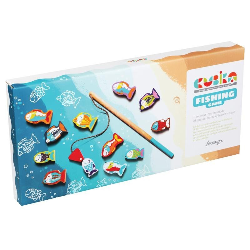CUBIKA is a new brand of wooden toys made only from ecologically grown wood, featuring very precise craftsmanship and appealing design. Fishing is a well-known game for children, where the goal is to catch as many fish from the pond as quickly as possible. This is done using two sturdy wooden rods equipped with magnets at their ends, as each fish has a metal piece embedded in it. The fish then jump out of the water as if they were alive. The range of toys from CUBIKA helps children develop primarily sensory-motor skills and abilities, logical thinking, creativity, imagination, and various cognitive knowledge. The toys are made from the highest quality maple and beech, and high-quality water-based paints are also used for coloring, which are completely safe for children and have no odor. All products from this brand have the German TÜV certificate and are made according to the European toy safety standard EN 71. Not suitable for children under 2 years. Made in Europe. Age 2+